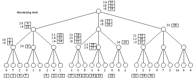- (Schritt 31) An der Wurzel stellt der Maximizer nun fest, daß im